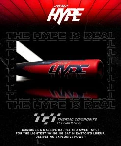 Experience the most explosive two-piece composite bat in the game! Featuring Thermo Composite Technology, the ADV Hype™ offers the ideal combination of a massive barrel and sweet spot with a light swing weight, delivering explosive power at the plate. ConneXion Max™ truly maximizes energy transfer with an even stiffer feel at contact, and injected with Nitrocell™ foam to reduce vibration. The Pro-Stiff Carbon Handle™ is specifically designed with extra-stiff carbon fibers to create a more solid handle and stiff feel players love. Power Boost™ Soft Knob technology provides hitters with more leverage, all while reducing vibration and improving comfort for the bottom hand. Flow-Tack™ Grip is Easton’s most-premium grip, providing ultimate cushion and tack. Easton BBCOR bats are used by top college programs and is the #1 Bat in College World Series® History.