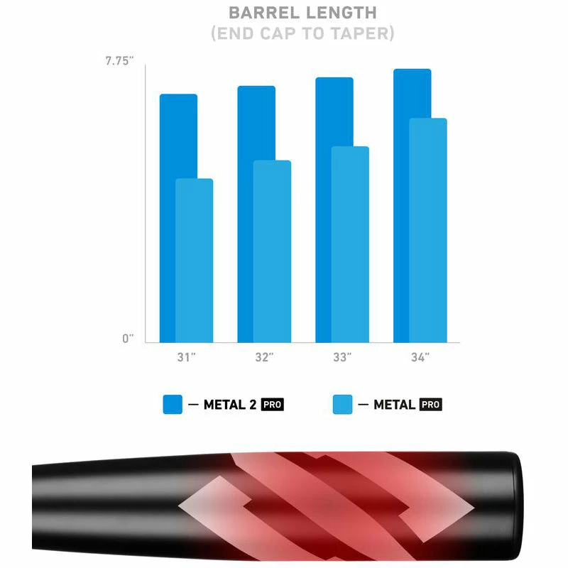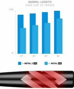 More barrel, more contact. The Metal 2 Pro BBCOR features an extended barrel and upgraded taper compared to the first generation Metal Pro. The longer barrel gives the Metal 2 more surface area and a larger sweet spot (highlighted in red in picture) to make contact with the baseball.