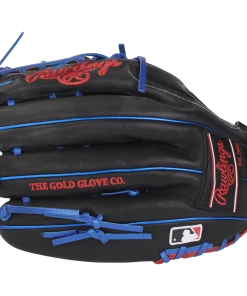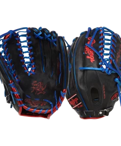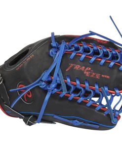 This 12.75-inch outfield glove comes in the same gameday pattern as superstar Mike Trout, who has used the distinctive Trap-Eze web for his entire career. On top of that, we added stylish blue and red accents to balance out the jet black Heart of the Hide leather, giving you a glove that looks as good as it feels (which is pretty amazing).