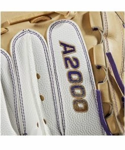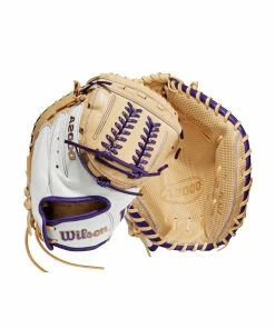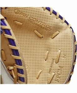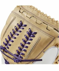 Former University of Florida star and USA Softball catcher Aubree Munro designed her latest A2000® AM1 fastpitch catcher’s mitt with a stunning combination of Blonde Pro Stock® Leather and White SuperSkin™ for unrivaled durability, feel and performance behind the plate. The Blonde Pro Stock leather palm of this 34” mitt features Spin Control™ Technology, a patented surface texture engineered to increase friction against the ball for handling pitches and faster transfers. The White SuperSkin™ back reduces glove weight, and the Victory Web with Hinge helps to frame every pitch. Purple laces and gradient Bold Logos in Purple and Blonde complete a royal look for a legendary catcher.
